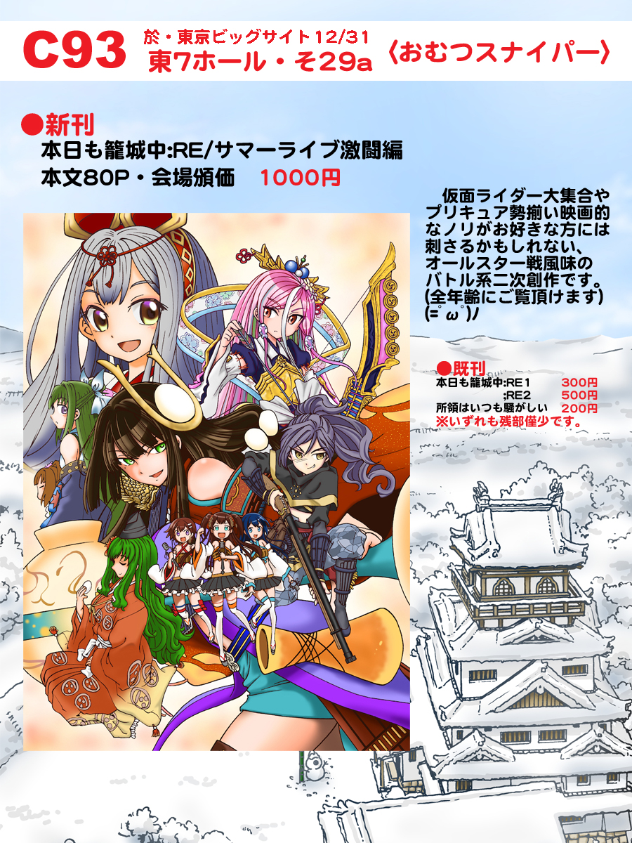 2017・冬コミのご案内です。 イベント参加 2017年12月28日 夏コミ落選のお知らせから随分と間があいて しまいました。とりあえず私は健在です。 ところでもう間もなく冬コミ開催日となって しまっておりますが、弊サークル・おむつ スナイパーは今回は無事3日目・東7-そ29aに 卓をいただきまして、そこに供える新刊も 何とか脱稿して迎える事となりました。 そんなわけでおしながき的なものをUPします。 今回は頑張って一挙80P描きおろしにて、 劇場版風味の長編に挑んでおります。 是非にご笑覧いただきたく、大晦日に お待ちいたしておりますー。 (=゚ω゚)ノ