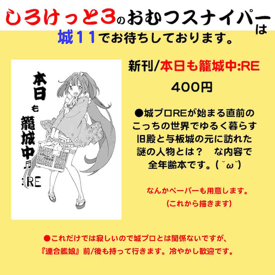 冬コミの参加情報です(遅刻 イベント参加 2016年12月31日 ご無沙汰いたしております。さしをです。 なんかうっかりしてるうちに、もう大晦日。 …つまり、冬コミ最終日でした。 わがサークル・おむつスナイパーは 東ホールの ニ・31aで 卓を頂いております。 (^◇^;) …開場まで10時間切ってる段階で告知 とか、かなり頭おかしいのですが、こうなった からには仕方有りません。 ともあれ、3日目の新刊は↓これ。 12ページのぺら本で200円での頒布となります。 また、同時に既刊の 『本日も籠城中RE』 『連合艦娘・前/後編。』 なども持ってまいります。よろしくお願いいたします。