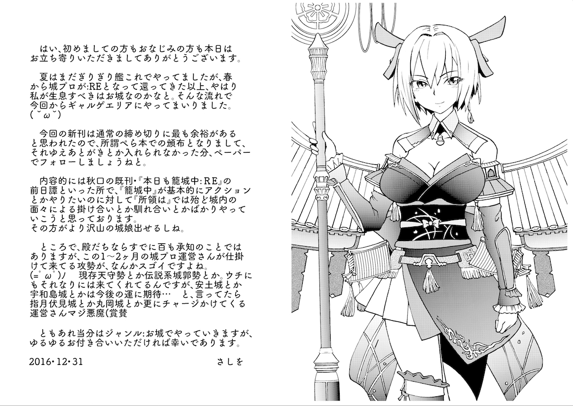 新年明けましておめでとうございます。 近況 2017年01月01日 そんなわけで、2017年到来でございます。 日頃の怠惰から今年は少しはまともな生活に 改めて行きたいなということで、元日から 更新しております。 大晦日の冬コミでは多くの方に当サークルの卓に お越しいただきました。また、様々に励ましの お言葉もいただき、ここ何年かの不甲斐なさも あり、反省しきりでありました。 今年は(こそは)みなさんと「やったね!」と喜びを 分かち合えるような仕事をしたいと思います。 そして↓が、冬コミで配りましたペーパーです。 結構用意してたんですが、途中で無くなって しまったのでここにUPします。 この一年、またよろしくお願い申し上げます。